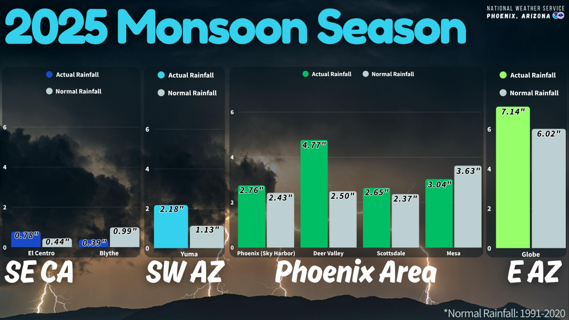 Monsoon season 2025 saw above normal/average rainfall across many sites around south-central AZ, SW AZ, and SE CA. Globe, AZ saw over an inch of rain above normal and Deer Valley, AZ saw over two inches of rain above normal. |