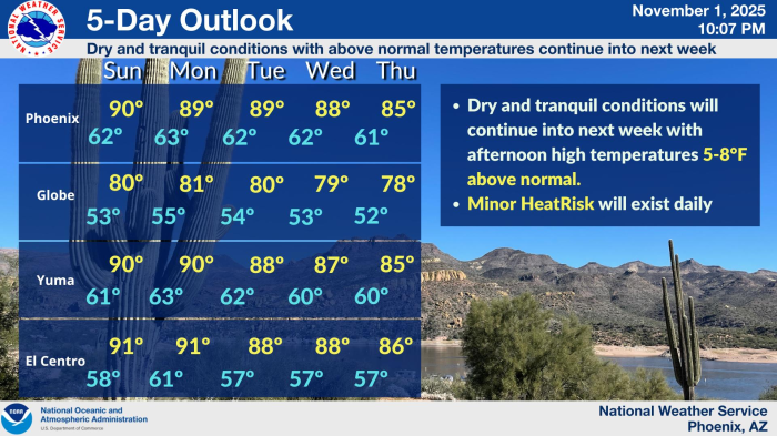 | Dry and tranquil weather conditions will continue into next week with afternoon high temperatures 5-8 degrees above normal. |